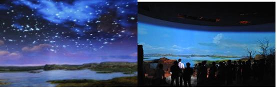 帶著對(duì)水洞溝的好奇,坐上大巴,很快見(jiàn)到了傳說(shuō)中的水洞溝,剛走進(jìn)大門(mén),看到的是一片荒涼,心中不免有些失望。隨著導(dǎo)游的聲音,走進(jìn)了水洞溝遺址博物館實(shí)景體驗(yàn)區(qū),我的心情豁然開(kāi)朗,從繁星點(diǎn)點(diǎn)的蒼穹、裊裊升起的炊煙、成群奔跑的犀牛、鴕鳥(niǎo)、羚羊,到水洞溝人打磨石器、分割獵物、制作鴕鳥(niǎo)蛋皮項(xiàng)鏈,到家園被毀、水洞溝人含淚離開(kāi),我們?cè)诙潭?0分鐘內(nèi)體驗(yàn)到“夢(mèng)回三萬(wàn)年”的情景。一切都是那么真實(shí),那么鮮活,仿佛遠(yuǎn)古的水洞溝先民就從我們身邊緩緩走過(guò)。